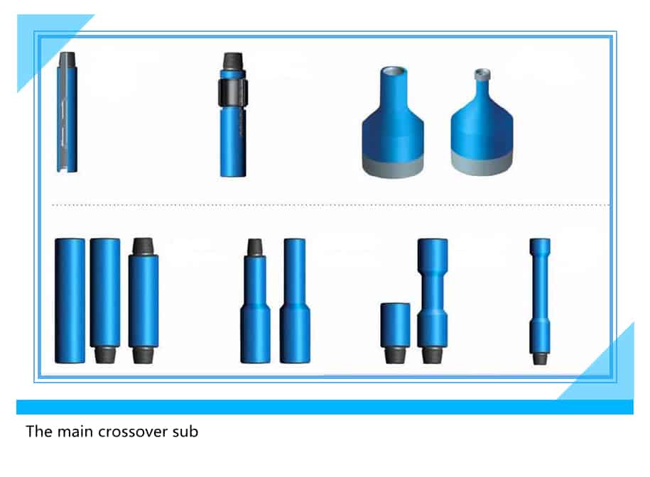 Crossover sub is mainly used to connect upper and lower drill tools in different connectors in drilling operations. Also it can be used to protect other tooling in drill stem (called saver sub) or be used to deliver outgoing air to the bit face just above the bit (called bit sub).